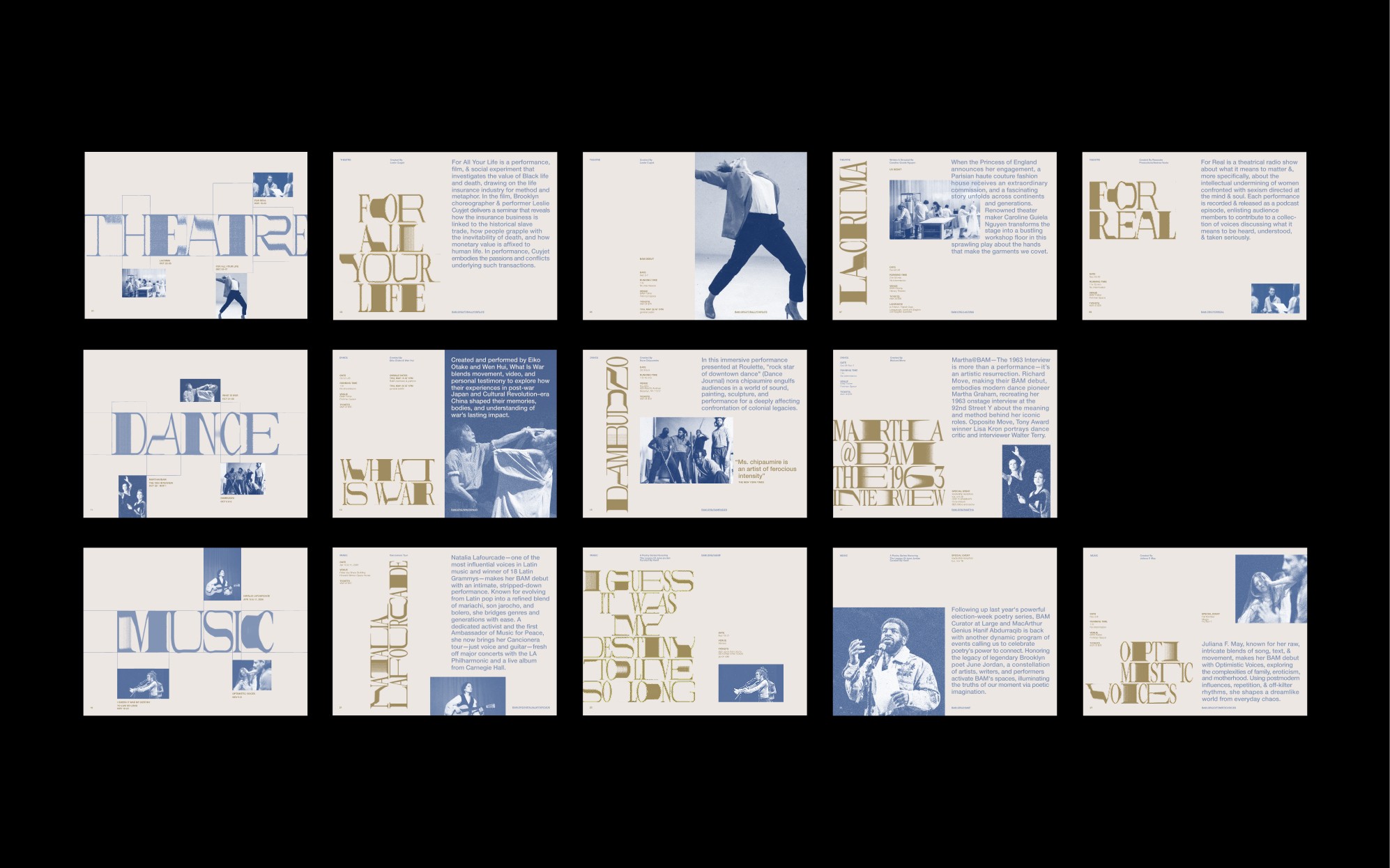 This project reimagines the visual program for BAM’s Next Wave Festival: an annual platform for experimental and contemporary art through a concept-driven design system. The work explores alternative formats and typographic structures to present complex event information with clarity, balancing expressive form-making with legibility for BAM’s culturally progressive audience.