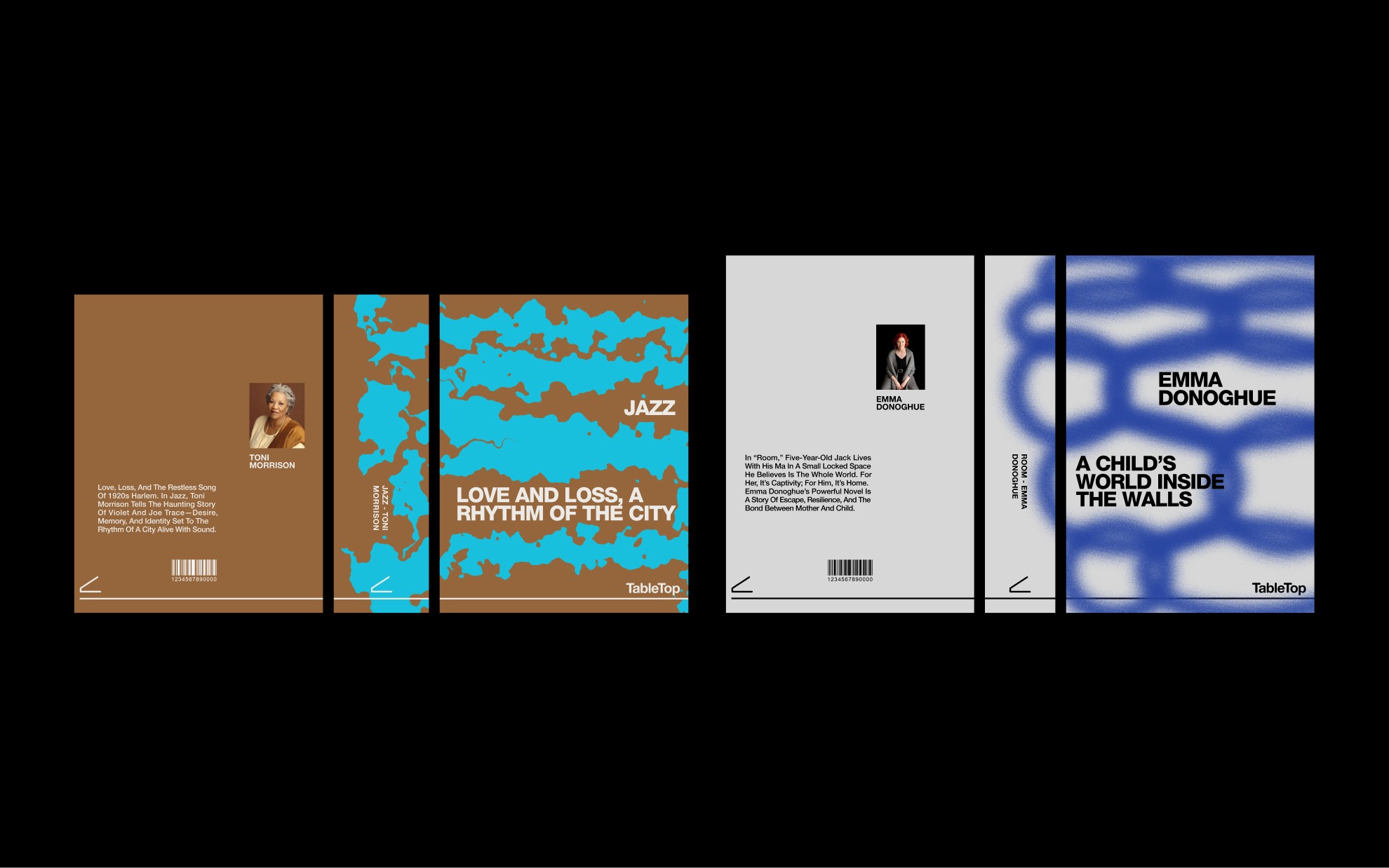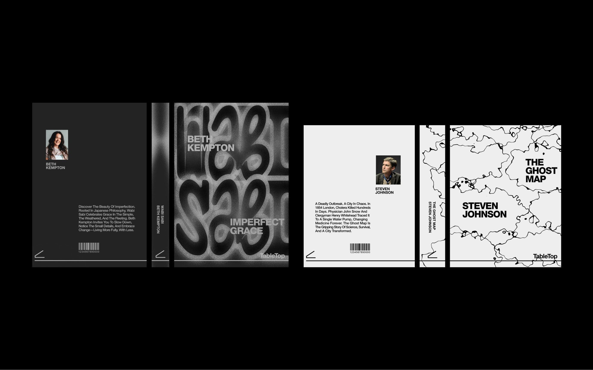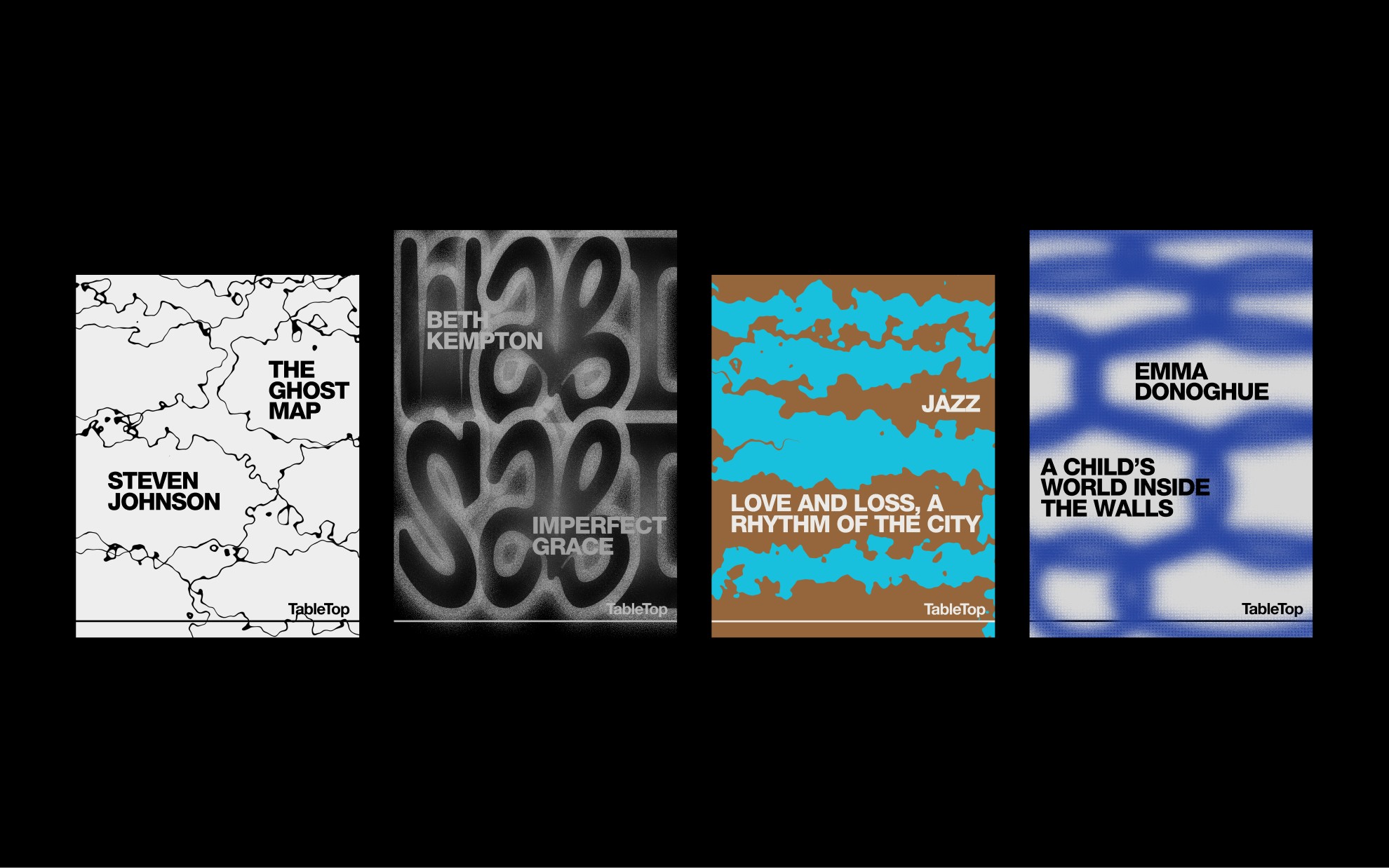 TableTop is a publishing company that specializes in coffee table and display books, items meant to be viewed, gathered, and used. Together with four book covers, two fiction and two non-fiction, the project creates a unified identity system by framing books as visual artifacts rather than tools for in-depth reading.